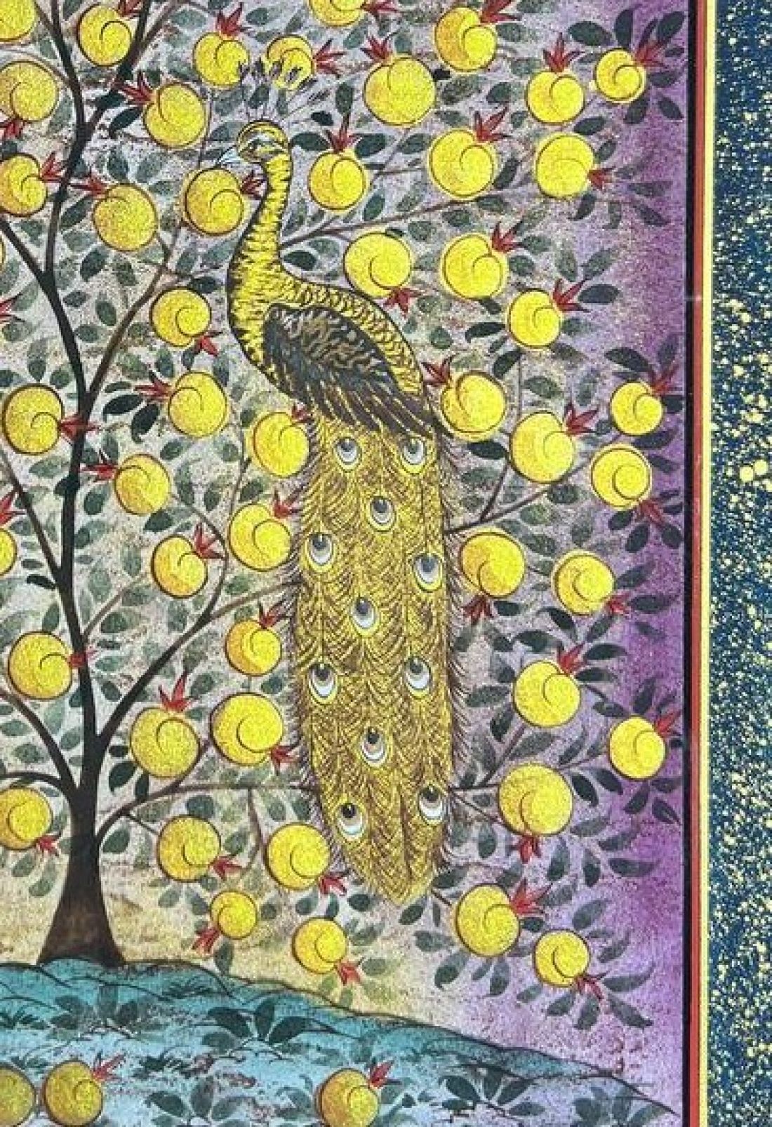 Wunderschöne, in violett und gold gehaltene Miniatur "Lebensbaum mit Pfauen". Masse 18x27cm.