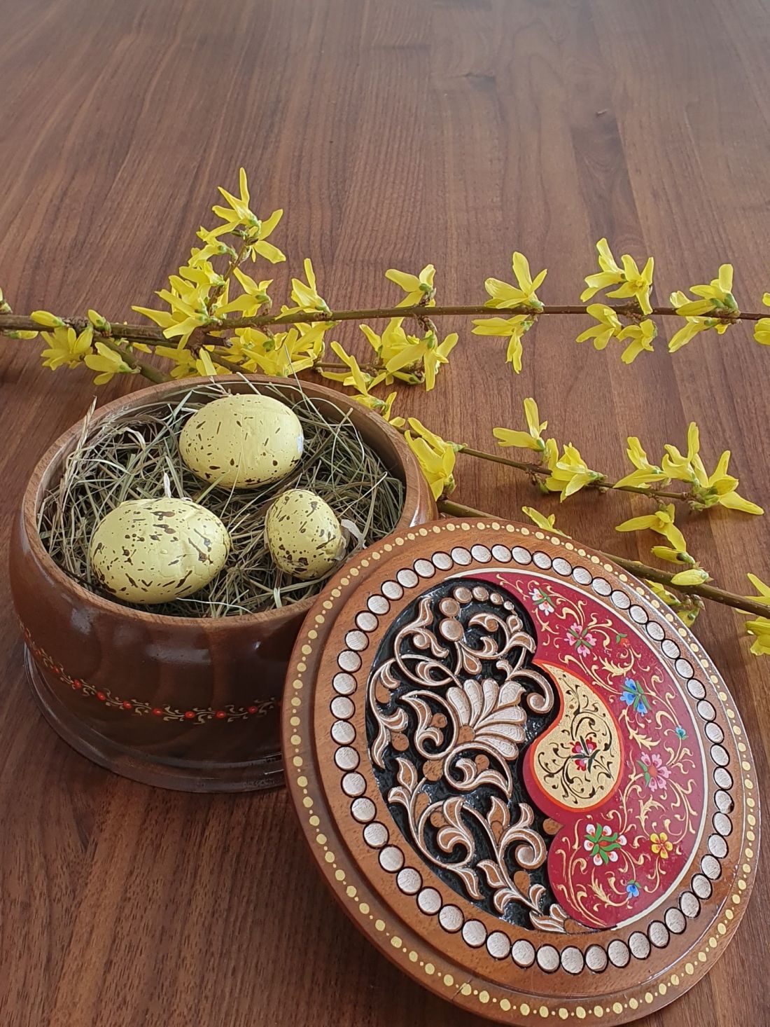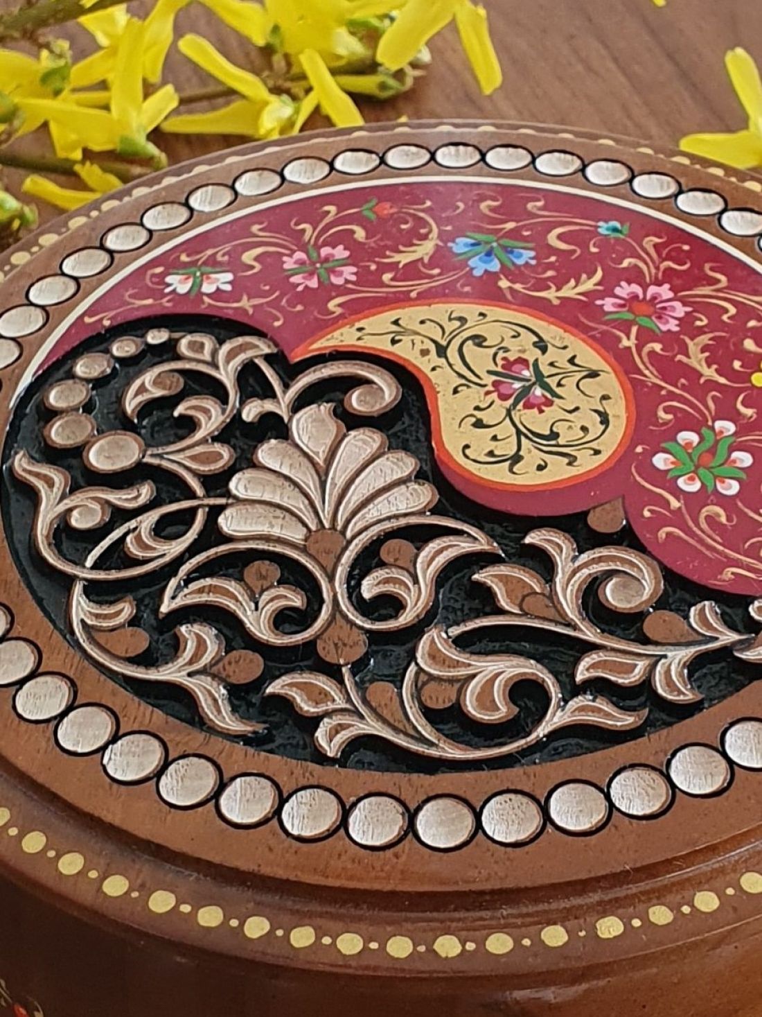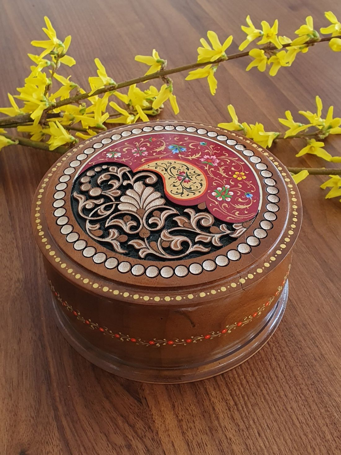 Runde Dose aus Nussbaumholz, Deckel je zur Hälfte geschnitzt und bemalt. Bordeaux / gold. Durchmesser 15cm, Höhe 7,5cm. Innen mit dunkelrotem Samt gefüttert. Preis: CHF 99.- exkl. Versand in der Schweiz CHF 7.-.