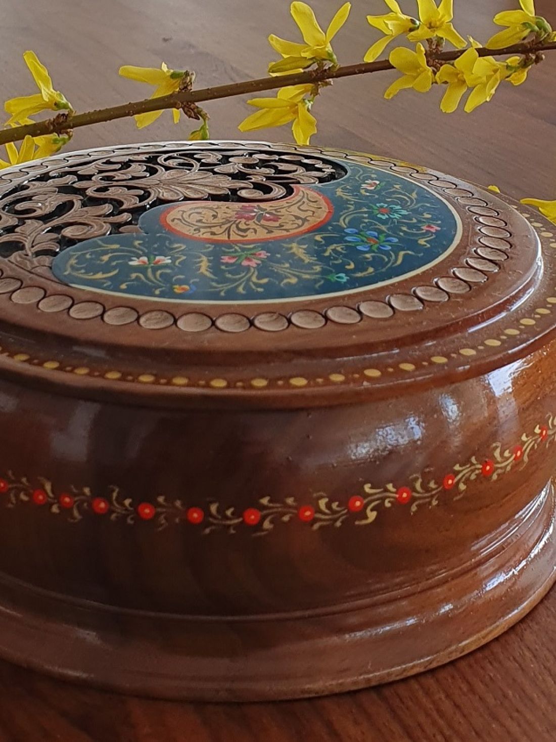 Runde Dose aus Nussbaumholz, Deckel je zur Hälfte geschnitzt und bemalt. Petrol / gold. Durchmesser 15cm, Höhe 6,5cm. Innen mit dunkelrotem Samt gefüttert. Preis: CHF 99.- exkl. Versand in der Schweiz CHF 7.-.