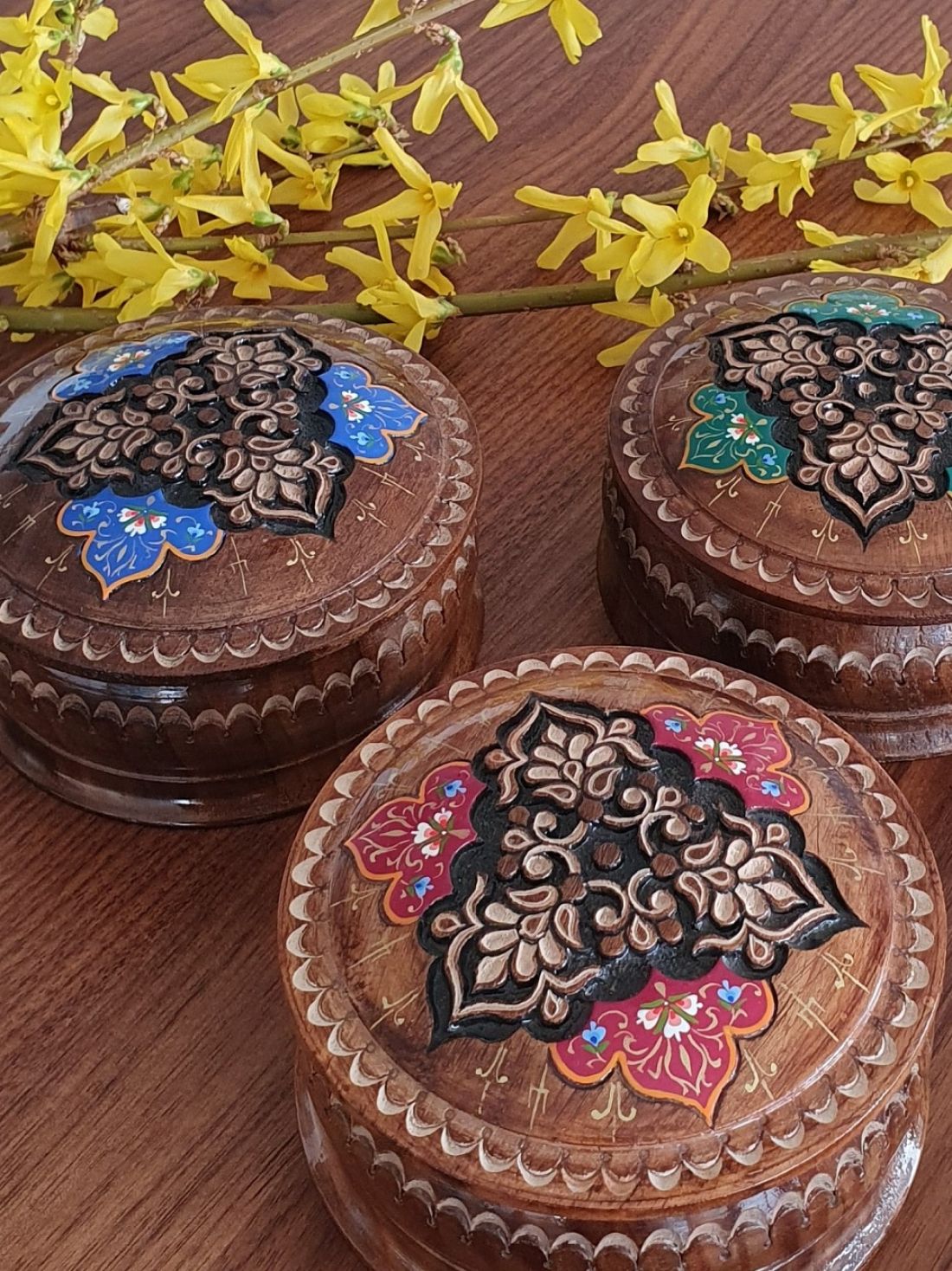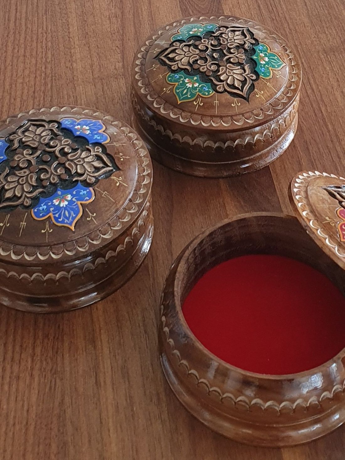 Schmuckdosen in grün oder blau (rot verkauft). Durchmesser 10cm, Höhe 4,5cm. Nussbaumholz. Innen gefüttert mit rotem Samt. Preis CHF 49.- exkl. Versand in der Schweiz CHF 7.-.