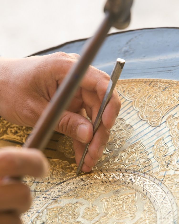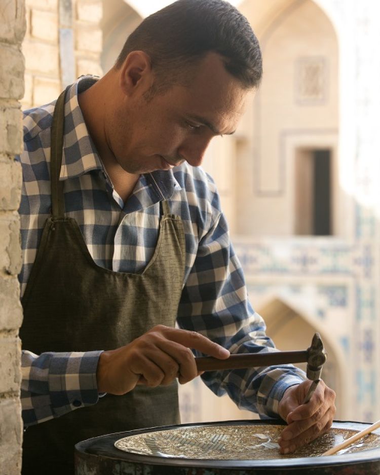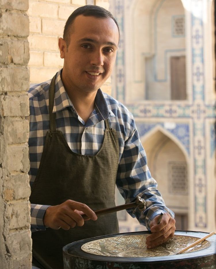 Anvar Kurbanov lives in Bukhara, in Uzbekistan. He is proud of being part of this famous and ancient city, where his own story begins, where he lives with his family and where his workshop is located. He is an accomplished metal chaser and uses mainly materials such as brass and copper.