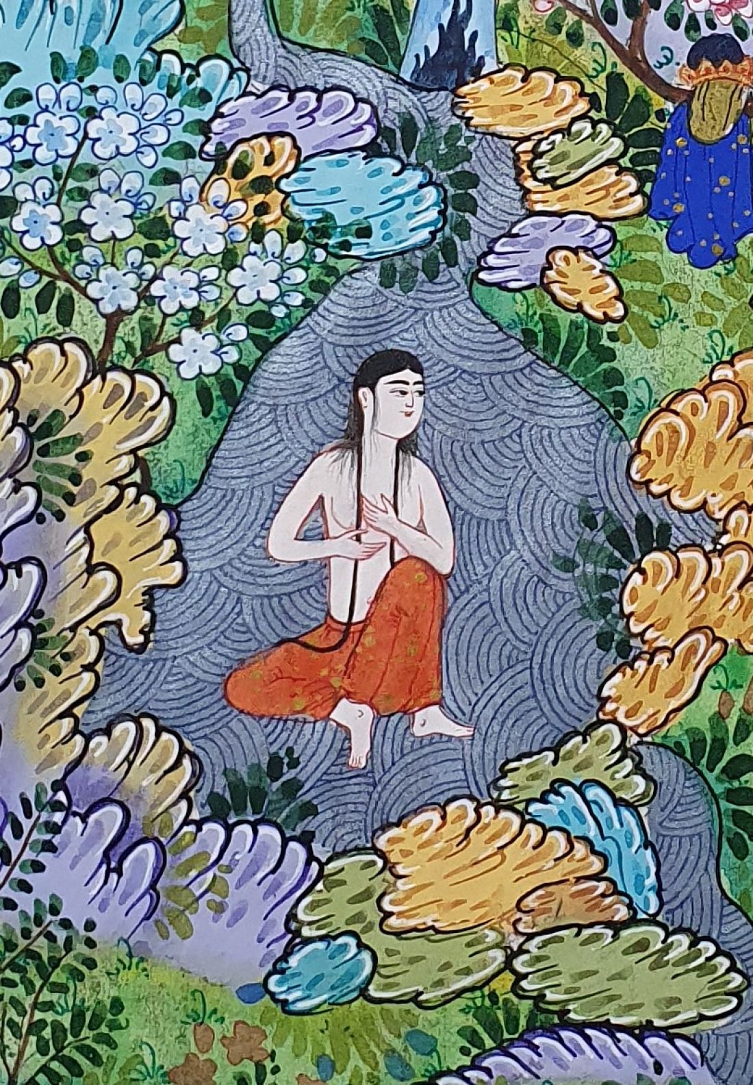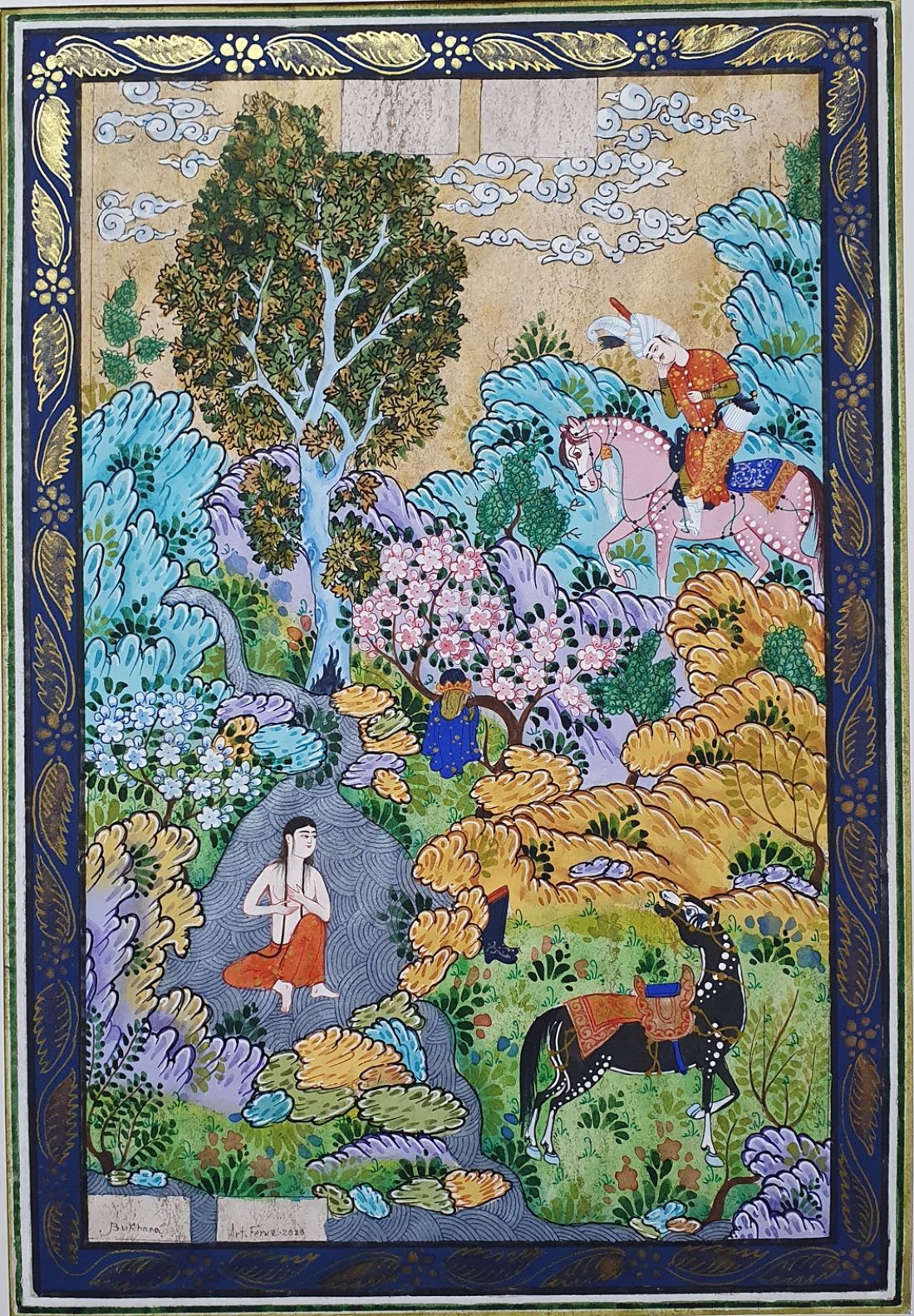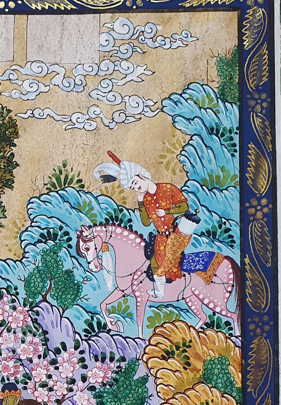 Scene from the love story of “Chosrau and Shirin”, a love story worked on by many Persian poets, which found its completion in the epic by the poet Nezami, written around 1200. Beautiful, richly decorated miniature. Dimensions 19,5x29cm.