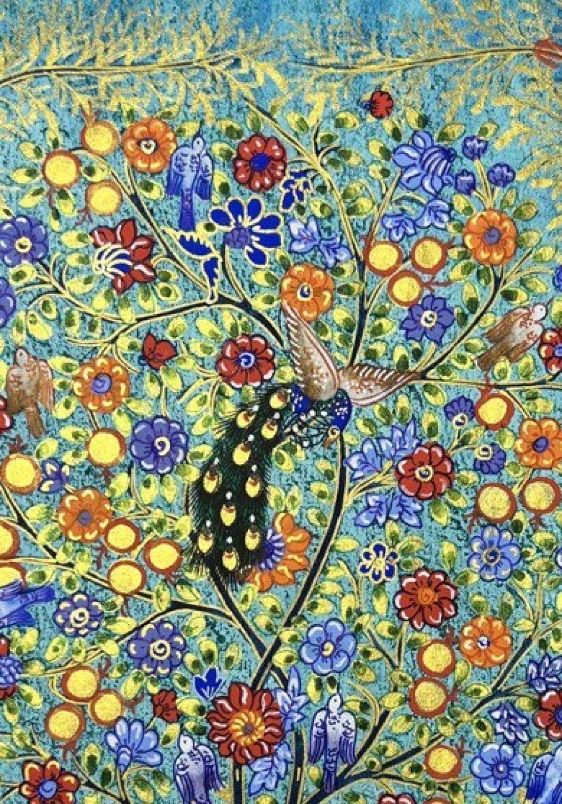 Miniature "Tree of Life with Peacocks" in turquoise and gold. The tree of life symbolizes fertility and is a popular motif in miniature painting. Dimensions 20,5x29cm.