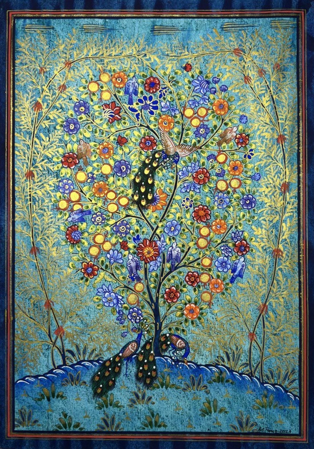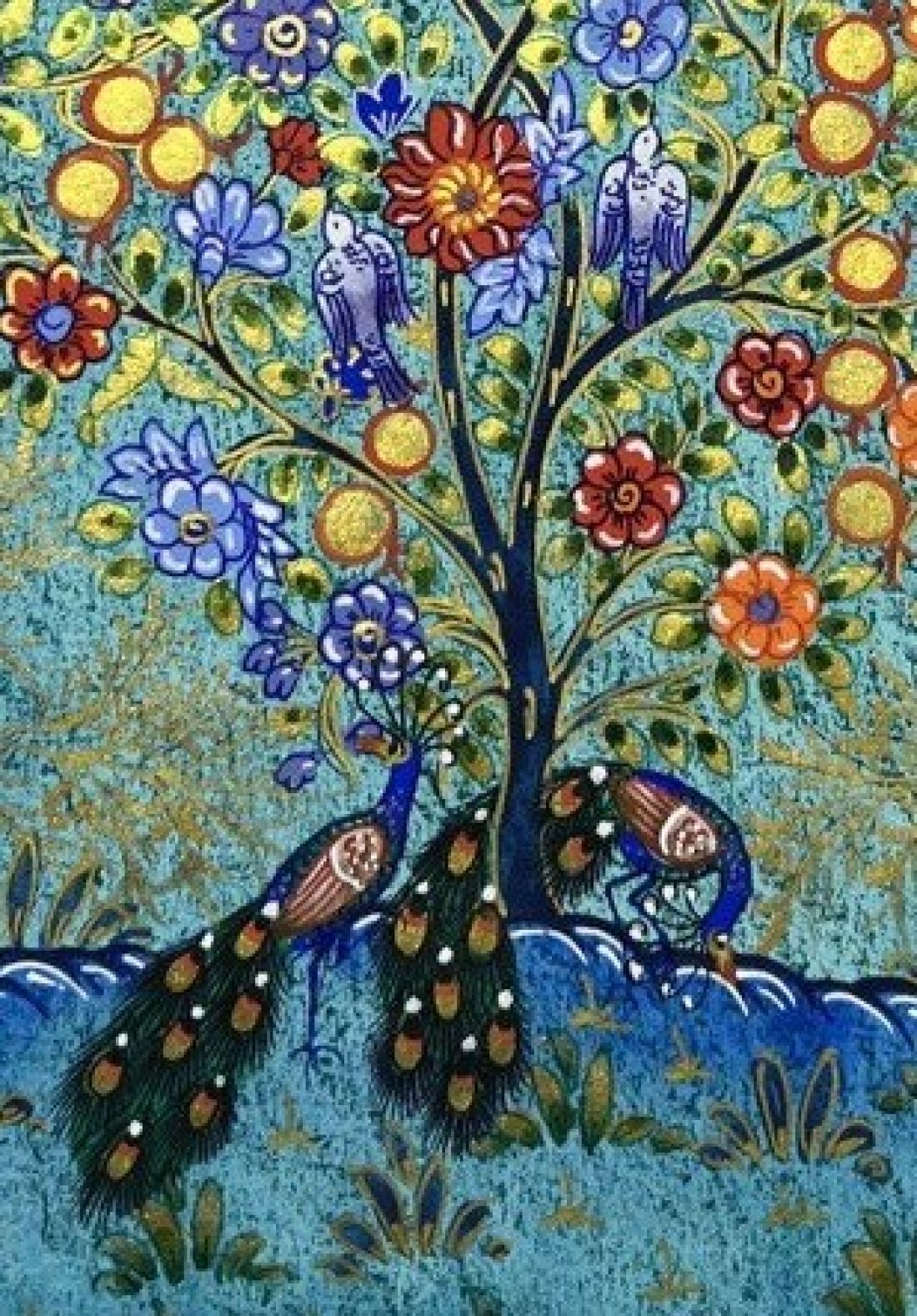 Miniature "Tree of Life with Peacocks" in turquoise and gold. The tree of life symbolizes fertility and is a popular motif in miniature painting. Dimensions 20,5x29cm.