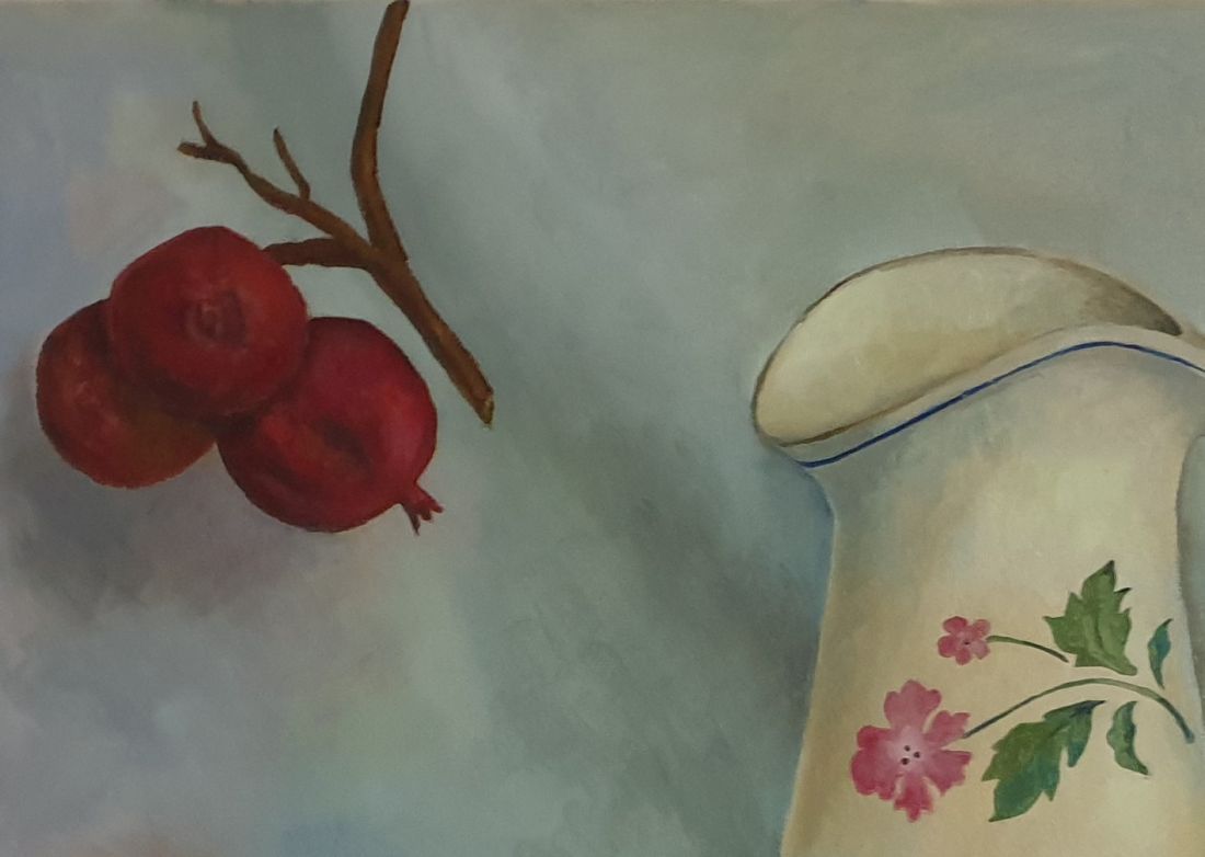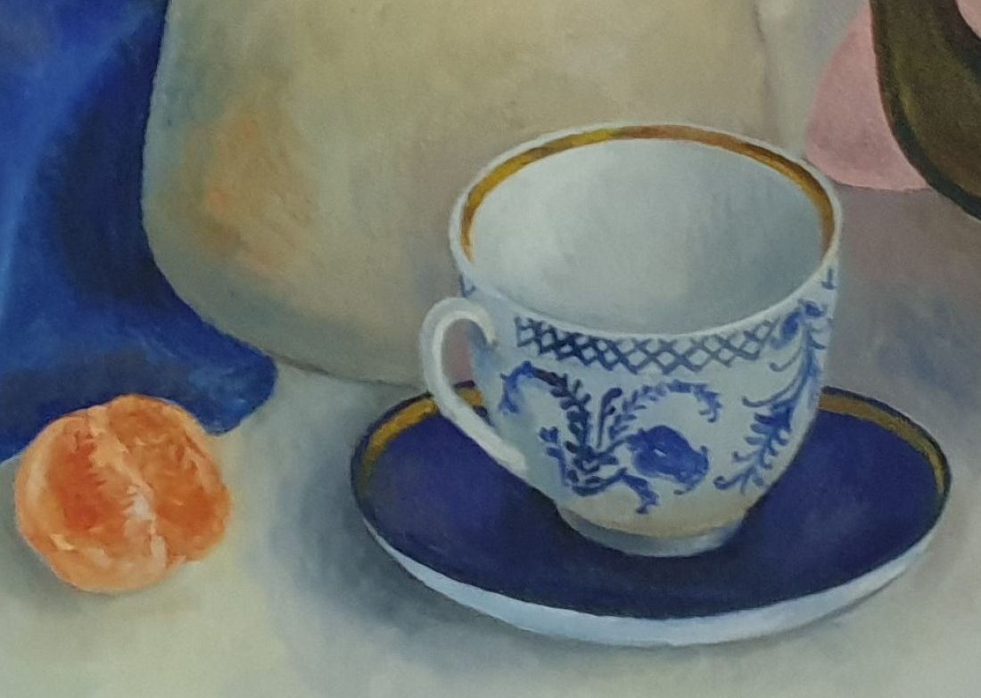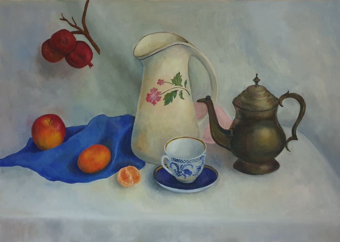 Still life "White Warmth" in light colours and filigree tendrils on jug and cup. Oil on canvas. Dimensions 50x70cm. CHF 660.- incl. shipping costs and VAT.